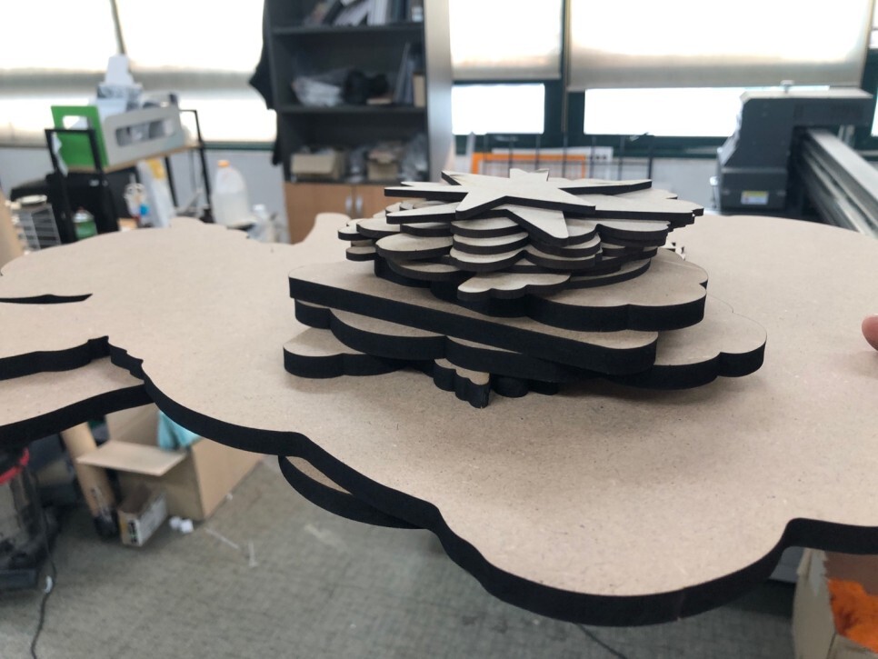 그렇게 레이저 가공이 끝난모습입니다! 이번엔 3T와 9T 두가지 MDF로 가공하였기 때문에